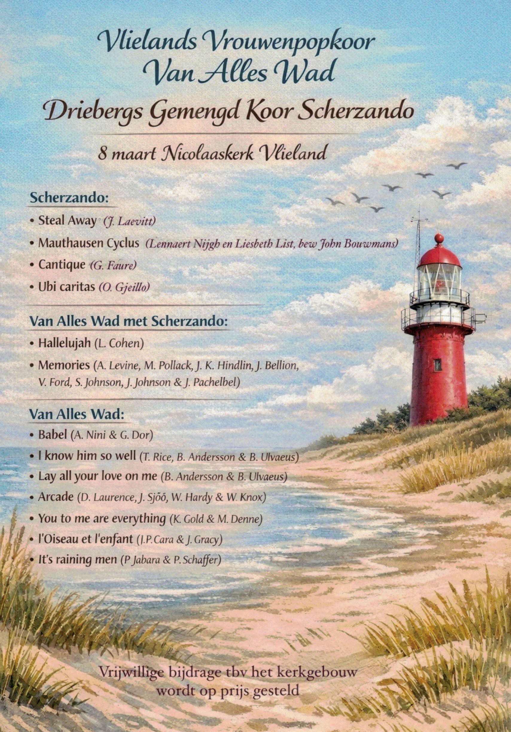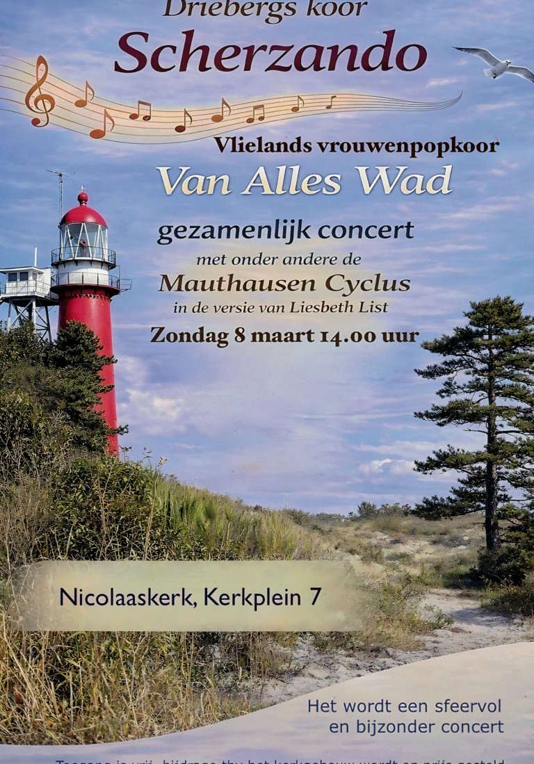 2026Op 8 maart gaven wij een concert in de Nicolaaskerk op Vlieland samen met het Vlielands vrouwenpopkoor Van Alles Wad. Scherzando zong o.a. de Mauthausen Cyclus en de Cantique (G.Faure), met begeleiding van Nobuko Takahashi, piano. Gezamenlijk met Van Alles Wad